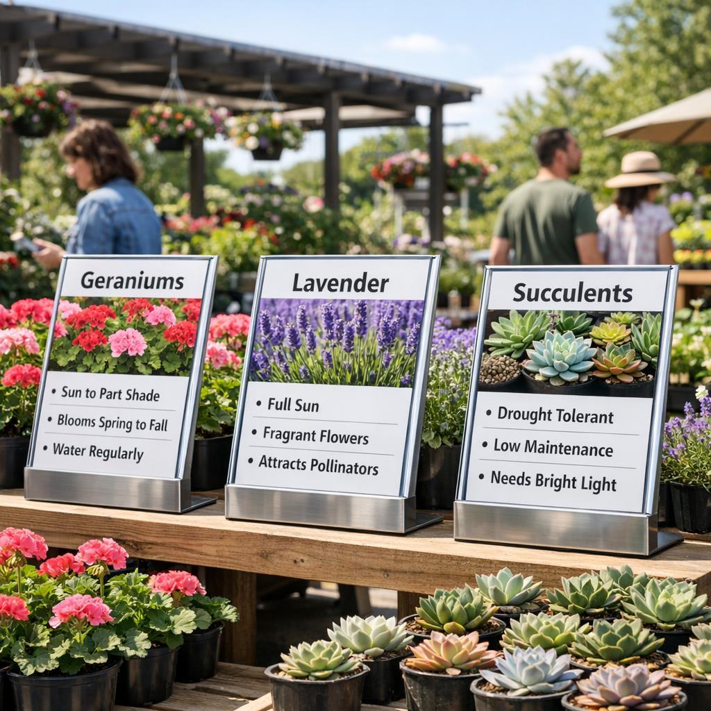 Im Gartenhandel informieren wetterfeste Tischaufsteller über Pflanzenarten, Pflegehinweise und Preise. Kunden finden so alle wichtigen Details direkt am Produkt. Das erleichtert die Kaufentscheidung und entlastet das Verkaufspersonal. Auch in Outdoor-Märkten oder saisonalen Verkaufsständen steigert die klare Beschilderung die Nutzererfahrung.
